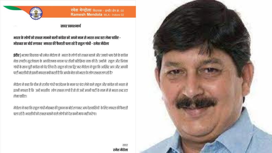 इंदौर : भाजपा विधायक रमेश मेंदोला ने भारत के लोगों को राक्षस बताने और उनको श्राप देने के कांग्रेस नेता रणदीप सुरजेवाला के आपत्तिजनक बयान पर तीखी प्रतिक्रिया व्यक्त की है। उन्होंने राहुल और प्रियंका गांधी के साथ पूरी कांग्रेस को घेर लिया है।